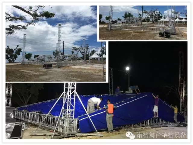 此次活动地位于塞班Garapan海边,舞台离海只有10米距离,灯光架需要搭建一个月之久在海边同时又是草地面,海风和阵雨及地面的沉降都是对架体结构的一个不小考验。