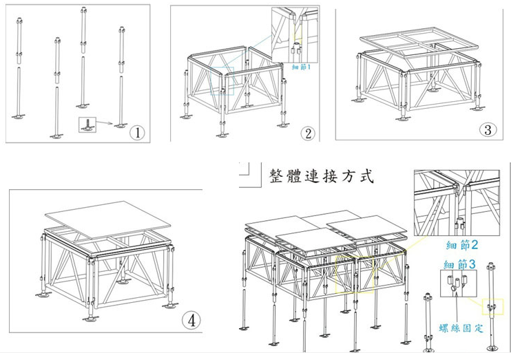铝合金拼装舞台每组之间连接的效果,台面之间几乎没有任何缝隙。