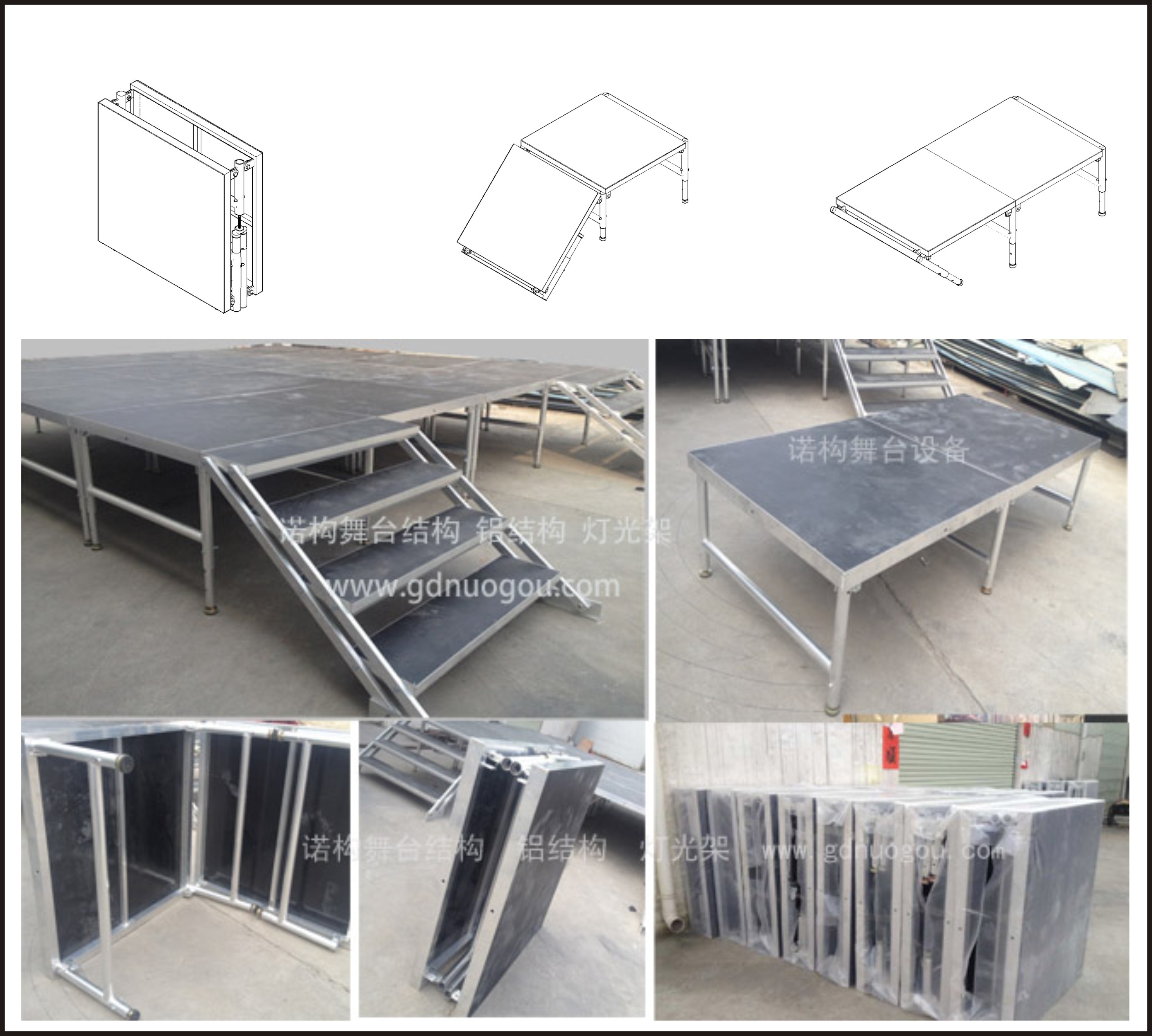 最新铝合金折叠舞台在酒店舞台的基础上研发而成,折叠后为一个四方整体方便运输及存放,整个舞台除了舞台板外采用全铝合金制作,全插销结构,结构轻便,从打开到安装完毕一张舞台不到1分钟,实现舞台搭建的一个突破,现有两个舞台框可选1*2M*H0.4-0.6M ,1.22*2.44M*0.6-1.0M.